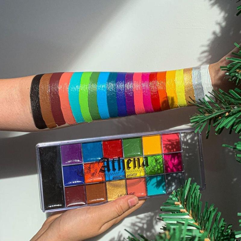 The UCANBE Athena Face and Body Oil Paint Palette includes 20 vibrant shades, with large amounts of black and white, ideal for creating everything from artistic looks to special effects. Its creamy, smooth, and easy-to-apply formula offers intense and comfortable coverage on the skin. The colors blend perfectly to achieve professional finishes, whether in cosplay, parties, performances, or creative makeup. Easy to apply and remove with olive oil or waterproof makeup remover.